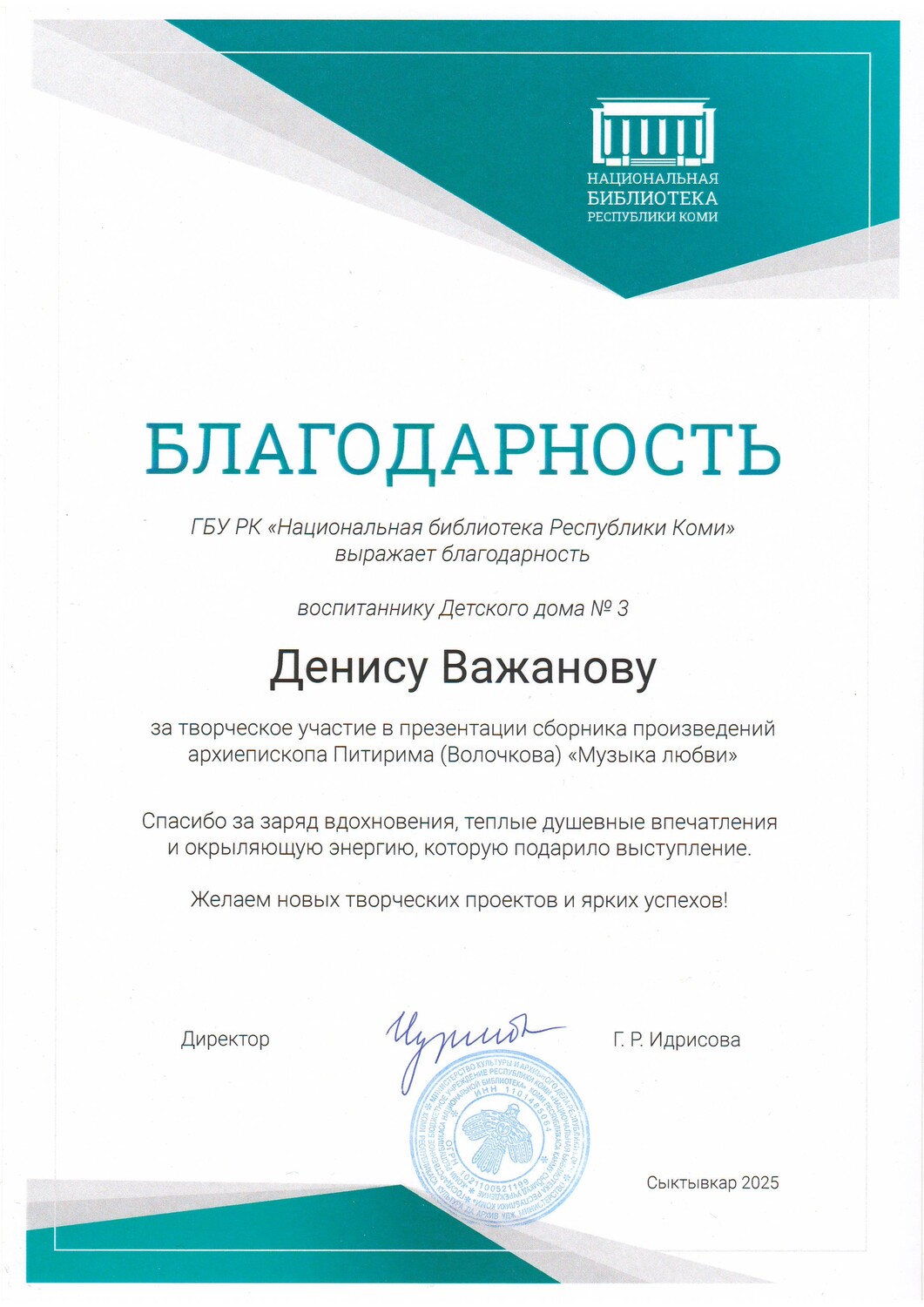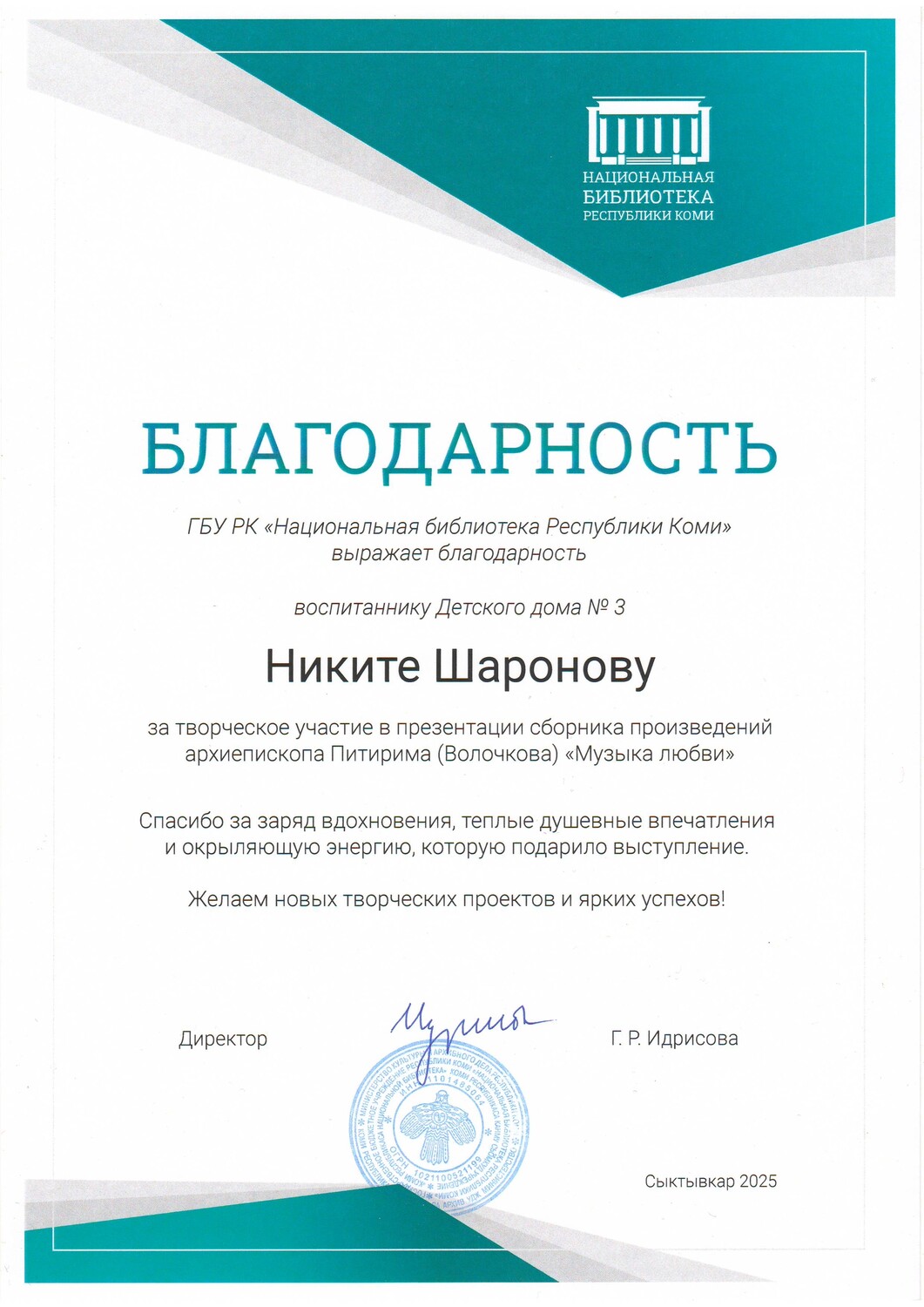 Благодарность за участие в презентации сборника стихов Владыки Питирима "Музыка любви"