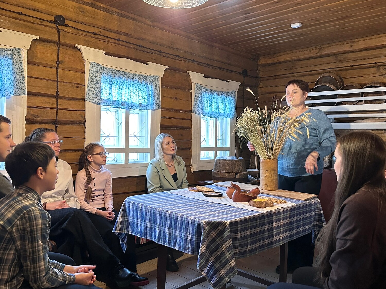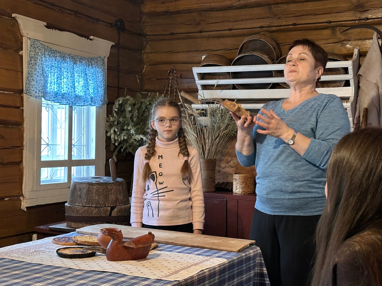 Мы узнали о пути рождения хлеба — от зерна до каравая, о семейных традициях коми семьи: как в старину принимали гостей, накрывали на стол, как относились к хлебу и как его готовили. Увидели колосья пшеницы, ржи и ячменя и традиционную коми выпечку: шаньги, черинянь, пызя-пирог. Самостоятельно попробовали размолоть зерно в муку на старинных жерновах, просеять её через решето и сито, раскатать тесто для пирога.